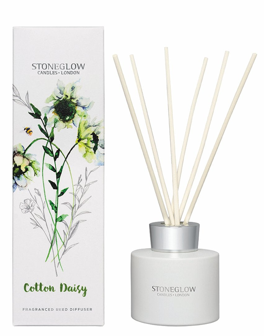 COTTON DAISY Stoneglow Botanics Reed Diffuser COTTON DAISY - Rose petals and delicate lilies are blended with white musk and exotic sandalwood to create this pure, clean and fresh scent. Stoneglow Botanics reed diffusers come beautifully gift boxed complete with 7 natural reeds, 120 ml of fragrance and will fragrance your room continuously for 2 to 3 months. Stoneglow Botanical Candles & Reed Diffusers bring together beautiful fragrances made with essential oils and natural botanical pieces. Stoneglow has over 25 years experience in designing and creating handmade candles & reed diffusers becoming the natural choice for high quality home fragrance. Stoneglow even grows and harvests some of the botanicals found in their candles & reed diffusers.