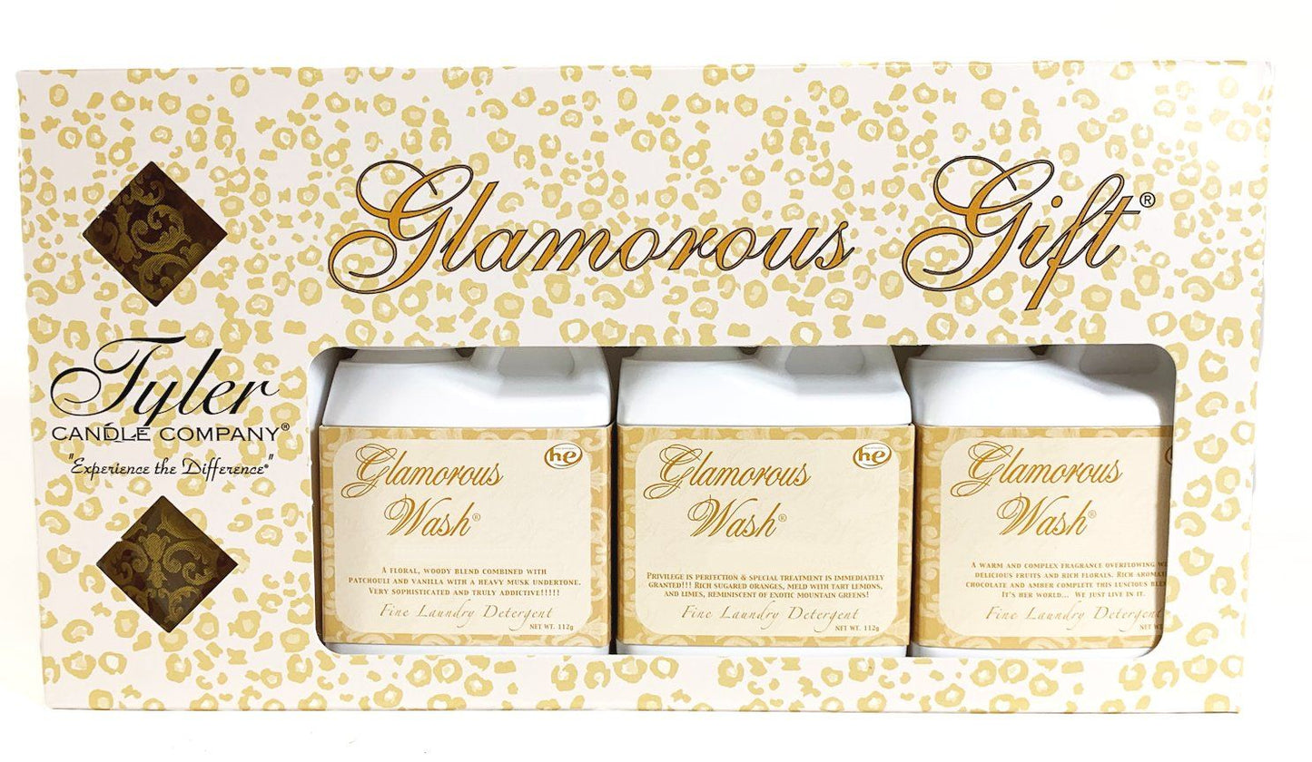 Glamorous Gift Set includes a 4 oz Glamorous Wash and Votives in three fragrances - Diva, High Maintenance & Iconplus 2 Glamorous Baroque Glass Votive Holders.