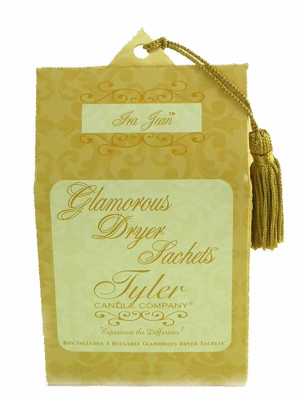 IRA JEAN Tyler Glamorous Sachets - Dryer Sheets Tyler Glamorous Sachets or Dryer Sheets are the perfect accessory to Tyler Glamorous Wash laundry Detergent. Tyer's Glamorous Sachets add the luxurious Tyler scents to your clean laundry in the dryer. Each Tyler Sachet may be reused to add fragrance and soften up to 8 loads of laundry. The Tyler Sachets may also be used to fragrance your home while vacuuming or add fragrance to a drawer or gym bag. Each box includes 4 reusable Glamorous Dryer Sachets or enough for up to 32 total loads of laundry. Ira Jean - A tribute to eternal femininity and southern refinement! Beautiful floral bouquet of Jasmine and Rose, combines with Musk and Sandalwood. This truly captivating fragrance is topped with a blend of fruity notes of Pineapple, Raspberry and Peach. Try All of Tyler Candles' fragranced products including: Scented Jar Candles, Mixer Melts, Room Sprays, Fragrance Lamp Oils, Reed Diffuser Oils, Hand Lotion, Hand Wash, Glamorous Wash Laundry Detergent, Sachets/Dryer Sheets, Faux Flame Perfumers and Autoglam Diffusers for your car!