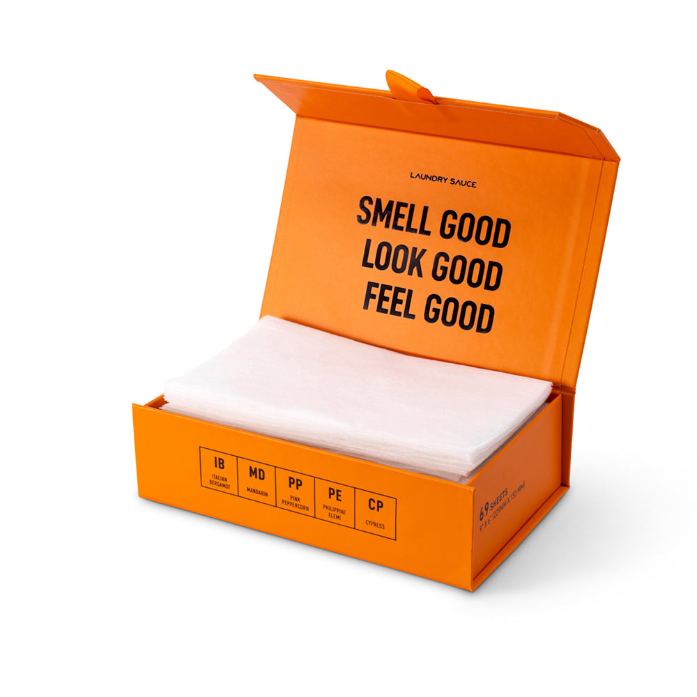 Laundry Sauce Dryer Sheets redefine your laundry experience. Expertly combating static, these sheets deposit sophisticated scents made with natural and responsibly sourced ingredients, delivering long lasting premium scent, while enhancing fabric softness. These Dryer Sheets promise a fresh, comfortable, and luxurious laundry experience in an effortless toss-and-dry method. (1 x 69 Dryer Sheets/box)
