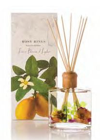 LEMON BLOSSOM & LYCHEE Rosy Rings Botanical Reed Diffuser Lemon Blossom & Lychee features light as air lemon blossoms aglow among sheer rose petals and ambrosial lychee. A blissful fragrance that is delicate yet lasting. Rosy Rings Botanical Reed Diffusers come in dramatic square bottles filled with real spices, fruit and botanicals. Everything you see in the bottle was placed there by hand. The beautiful 13 oz vessel comes with a decorative wooden cap and 10 natural reeds. Fragrances your room continuously for 6 to 9 months.