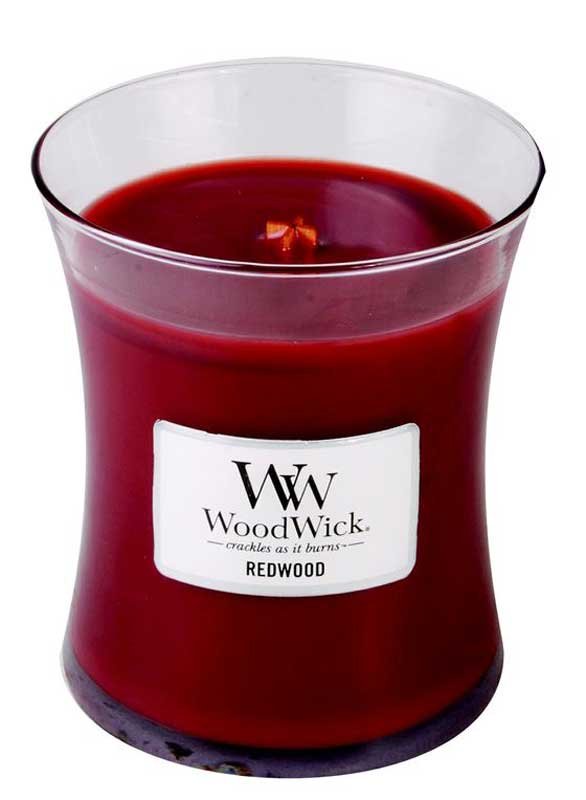 Redwood - WoodWick 10oz Large Jar Candle Burns 100 Hours Combines rich redwood and sandalwood with a hint of soft amber. The 10oz jar candle fragrances up to 100 hours. Our highly fragranced jar candles feature WoodWick's PLUS "+" shaped natural wooden wick to create the soothing sound of a crackling fire. Each WoodWick 10oz candle comes with a wooden wick and wooden candle lid.